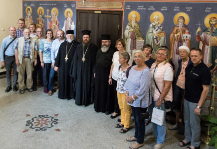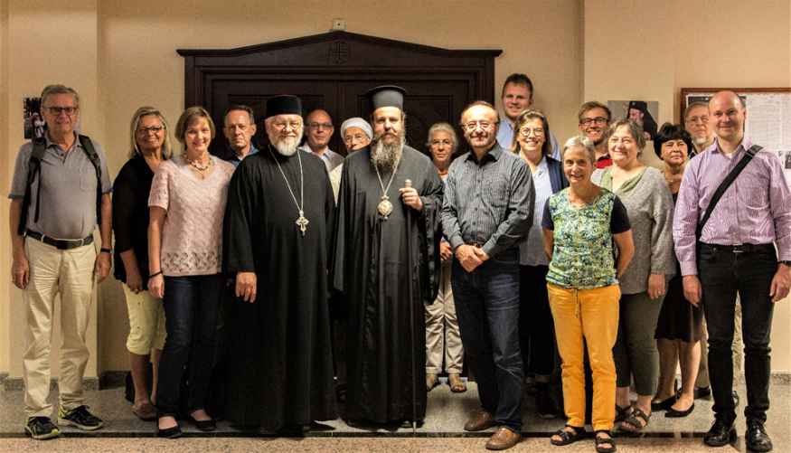 Die Oriens-Occidens-Reisegruppe in der Bulgarisch-Orthodoxen Metropolie in Goce Delchev mit Metropolit Serafim.